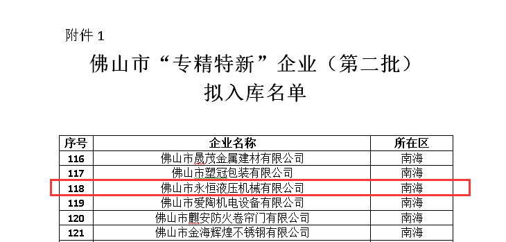 永恒液壓憑借廣闊的市場(chǎng)空間、產(chǎn)品用途的專(zhuān)門(mén)性、生產(chǎn)工藝的專(zhuān)業(yè)性及自主技術(shù)的專(zhuān)有性,成功入庫(kù)佛山市“專(zhuān)精特新”企業(yè)。